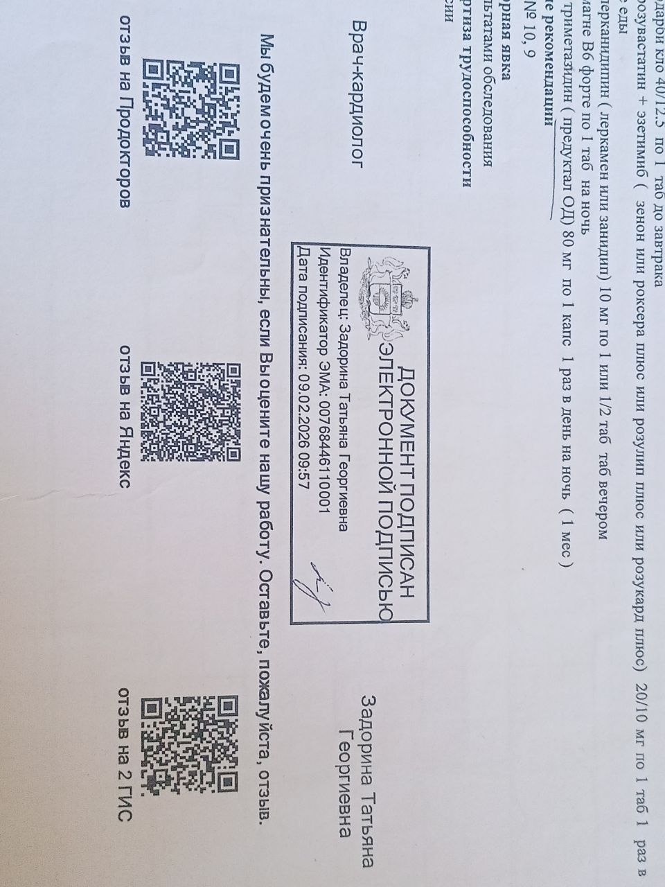 Хочу выразить огромную благодарность кардиологу Задориной Татьяне Георгиевне из поликлиники им. Нигинского!