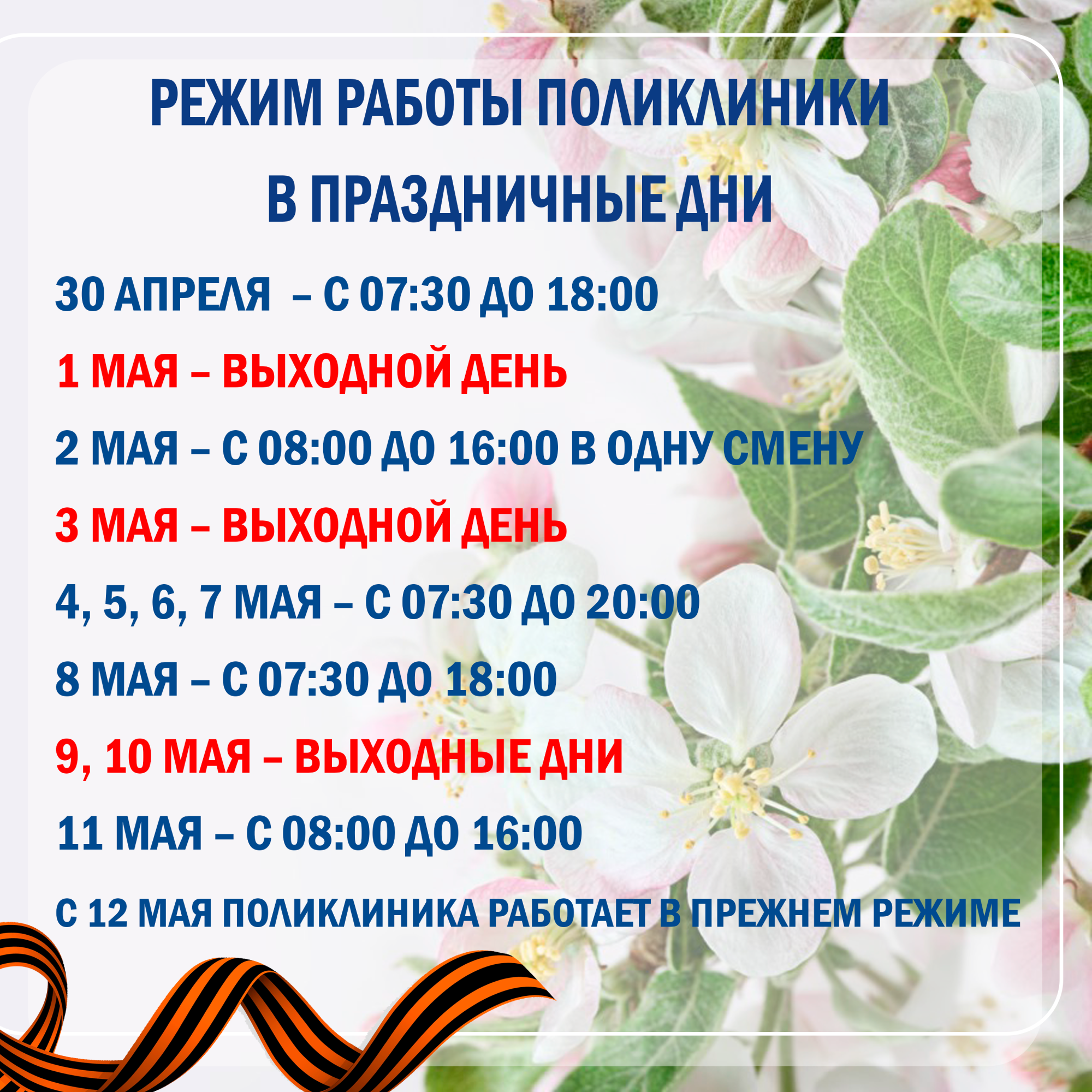 В майские праздники наша поликлиника продолжает работать, и это отличная возможность не только отдохнуть, но и уделить внимание своему здоровью!